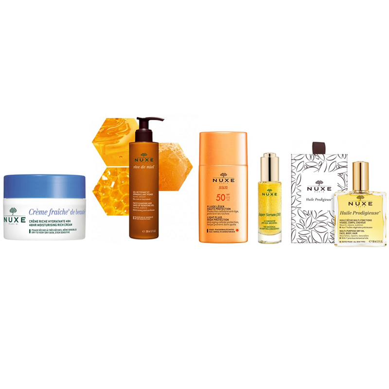 Empezaremos con el gel limpiador Nuxe Rêve de miel. Secaremos a toques suavemente. A continuación aplicaremos el Súper sérum 10, sólo media pipeta. Después aplicaremos la crema hidratante Crème fraîche, sin olvidarnos del fotoprotector solar.